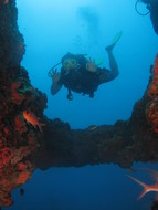 Almost like the arched body position, but underwater instead of in freefall. (720 x 960, 127k) | |  Posing at the remains of the waterwheel in the Vapor de Baixo wreck site. (1280 x 960, 209k) | |  Bubbles. "He like bubbles." (1280 x 960, 264k) | |
