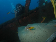 The ray and its companion were the stars of the dive (1280 x 960, 489k) | |  Now from a somewhat safer distance (1280 x 960, 403k) | |  Overview of the lower portion of the Servemar X wreck site, showing how large the rays were (1280 x 960, 479k) | |